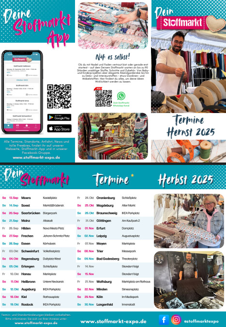 Wir freuen uns, Sie auf einem der Stoffemärkte an unserem Stand begrüßen zu dürfen!